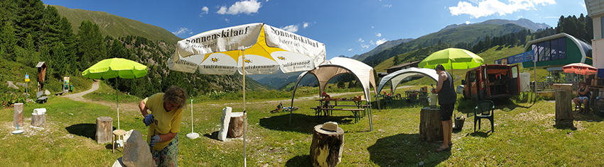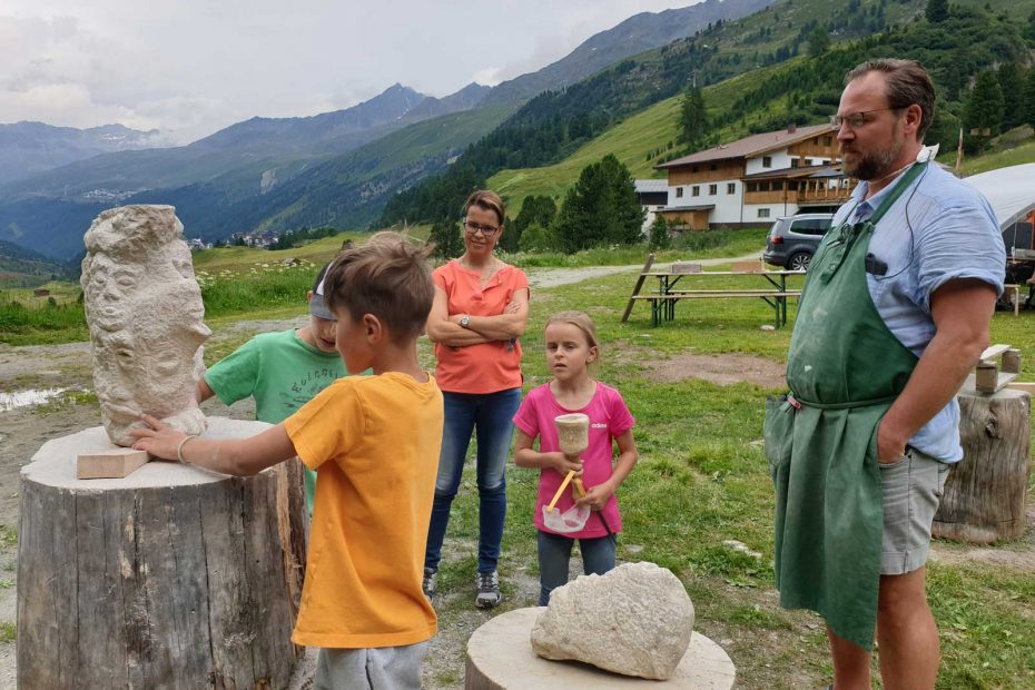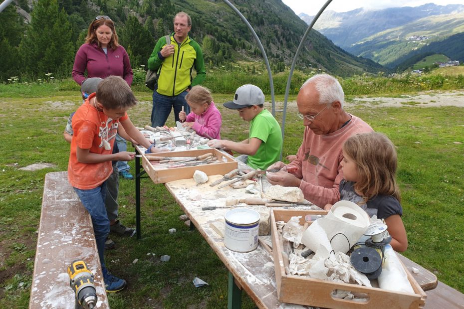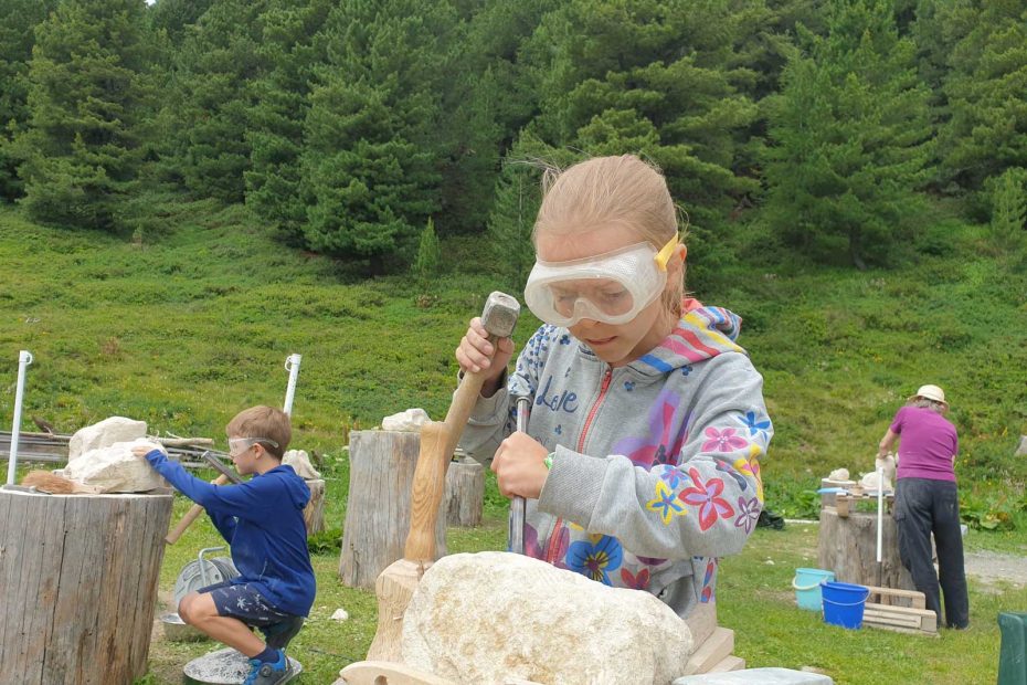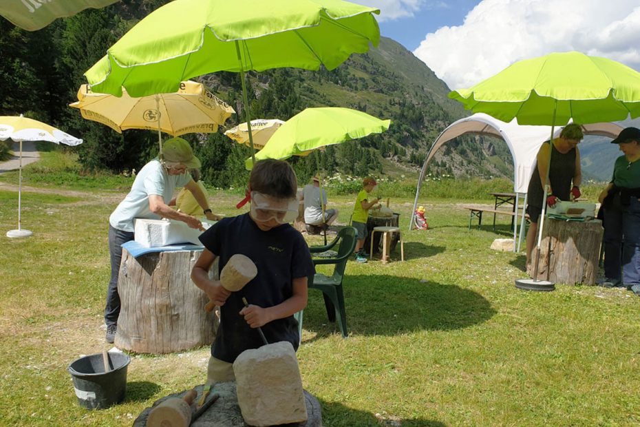 „Der Berg ruft“ zum Steinschlagen und wandern, sowie zu vielfältigen Begegnungen mit Mensch und Natur. Dem Himmel nahe auf 2000m Höhe zwischen schneebedeckten Bergen und rauschenden Wasserfällen schlagen wir Kalkstein, Marmor, und Granit. Speckstein und Alabaster stehen für Kinder zur Verfügung.